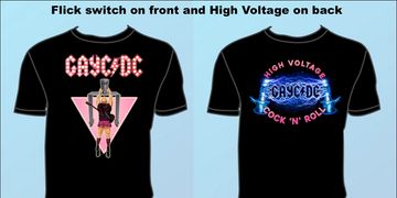 Our logo in Broadway lights with our Steve flicking the switch and lightning High Voltage on the back